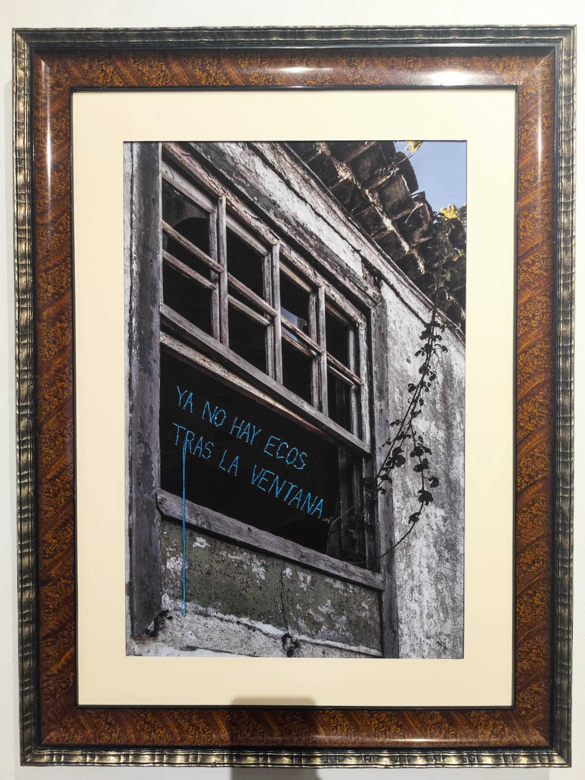 En otra sala de la Casa Salazar veremos la propuesta de la polifacética Miriam González Álvarez, escritora y graduada en Bellas Artes. Unas costuras hilvanan frases sobre fotografías de lugares olvidados, y se va componiendo el texto de un poema, que comienza así: