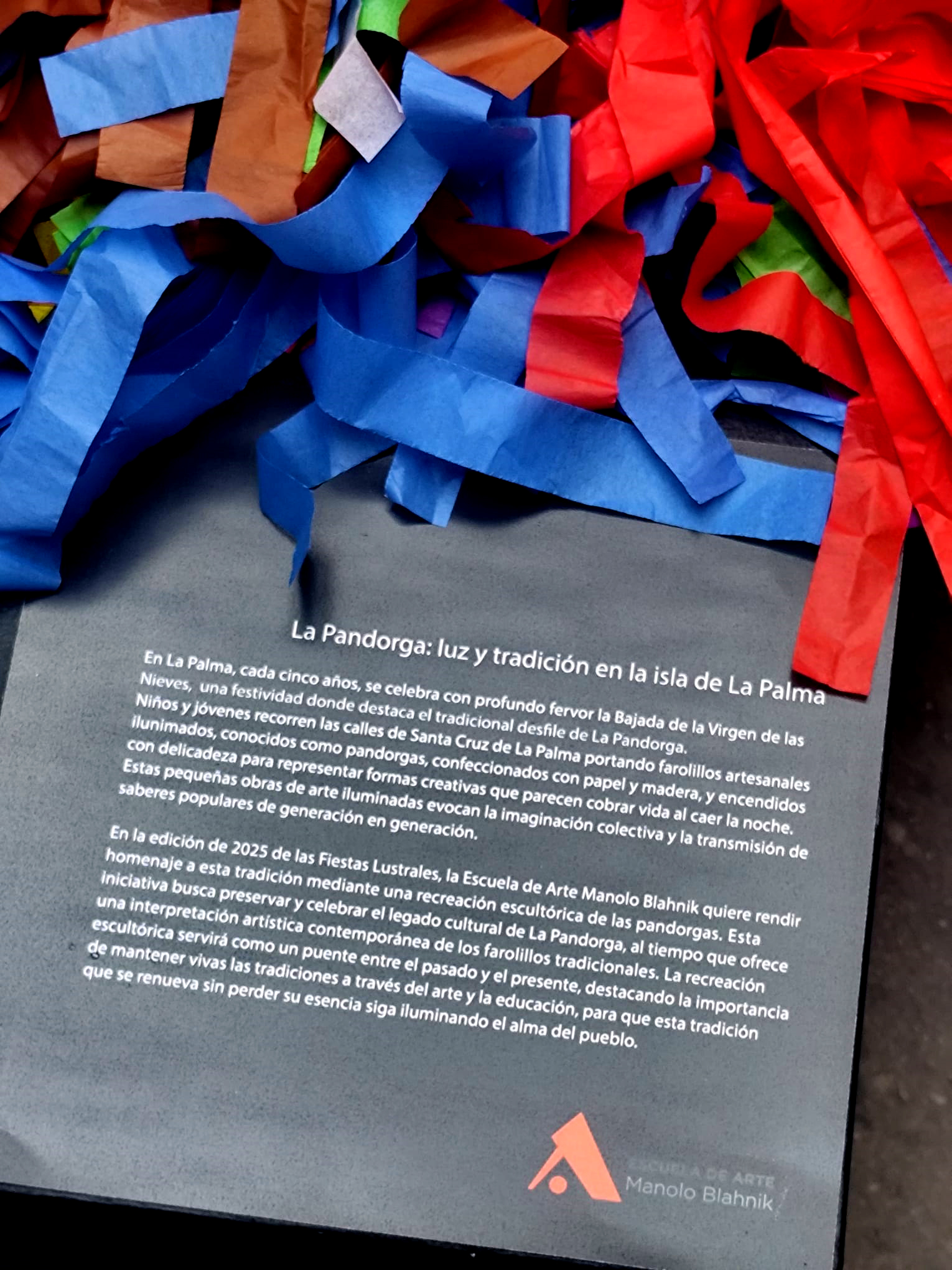 En el patio, antes de llegar a las salas donde se encuentran las distintas muestras, nos recibe una escultura creada por alumnos de la Escuela de Arte de La Palma y que homenajea al desfile de la Pandorga.
